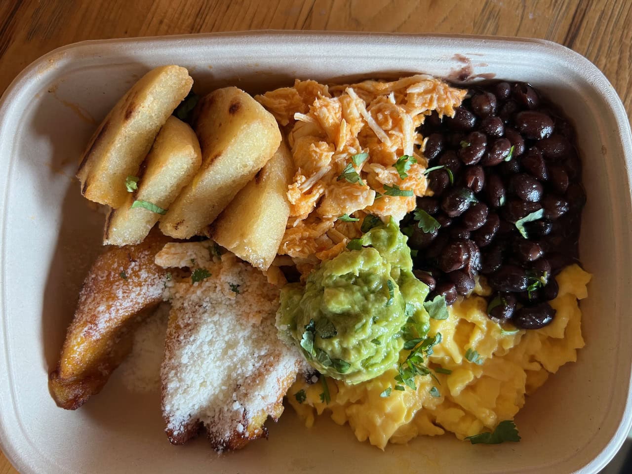 The Venezuelan breakfast lets you choose between shredded beef or chicken, served with scrambled eggs, black beans, plantains, avocado, cheese, and little triangles of fried arepas.