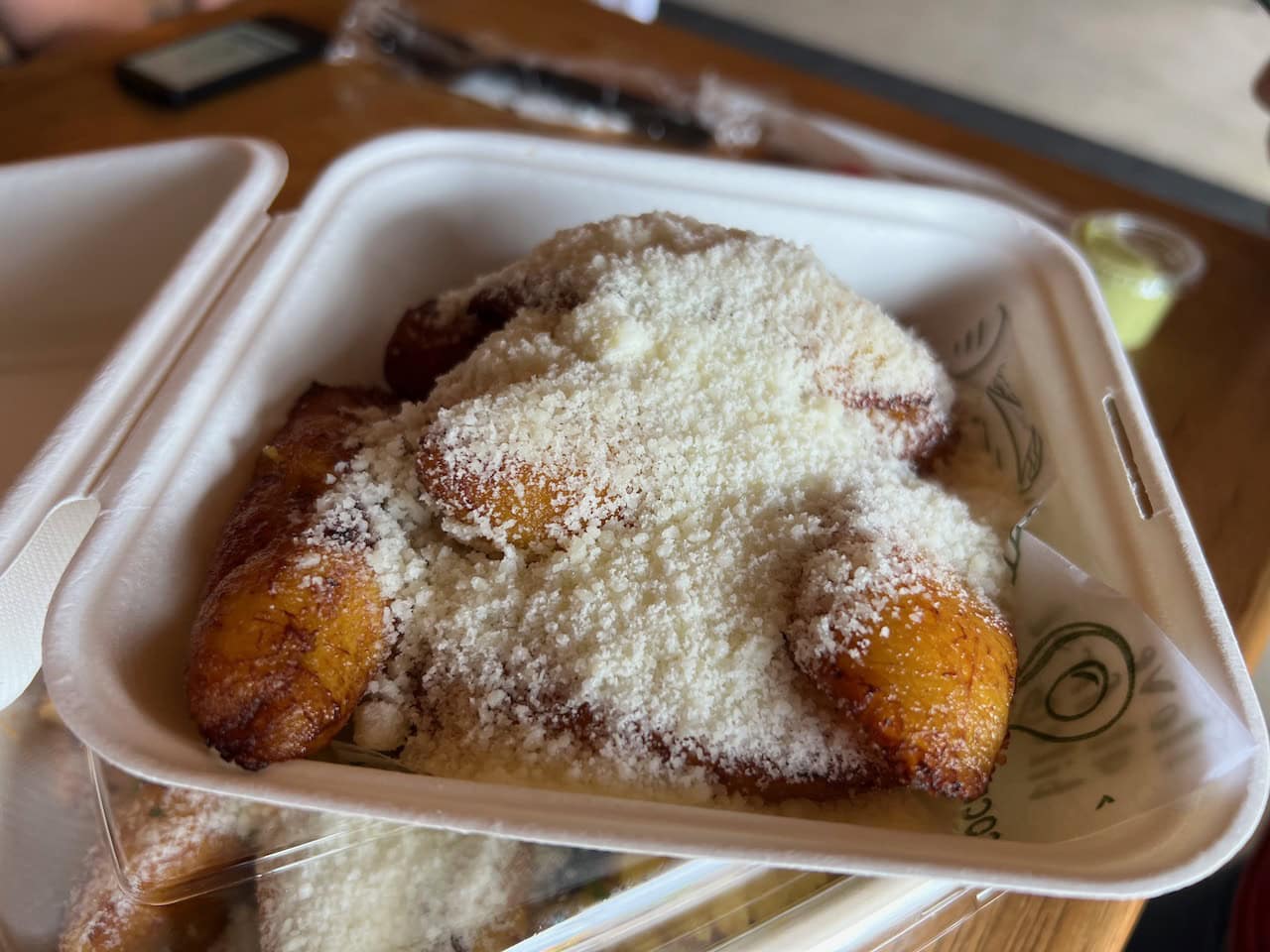 You can start with a generous portion of sweet plantains, heavily dusted with cheese.