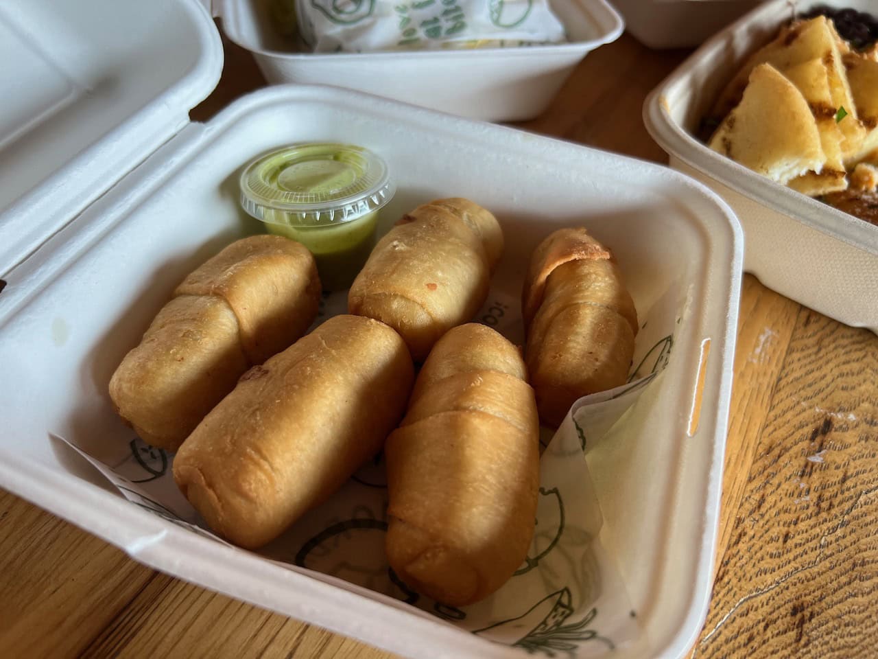 Or their delightful tequeños, breaded cheese sticks. Most dishes are served with their cilantro sauce; you will find yourself ordering extra.